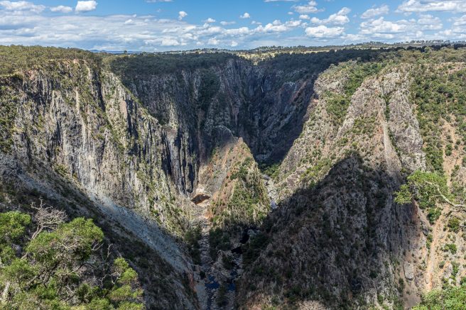 My heart skips a beat as we descend into a gaping chasm in the earth; Dangars Gorge, whose sheer cliffs guard a lush, meandering valley below. Far below, as the butterflies in my stomach keep reminding me. I’d watched that seemingly arbitrary hole in the earth – the edge of the New England gorge country – rapidly get bigger as the tiny two-seat helicopter in which I am a passenger soared across the plateau of golden brown farmland to this starkly contrasting, verdant abyss.